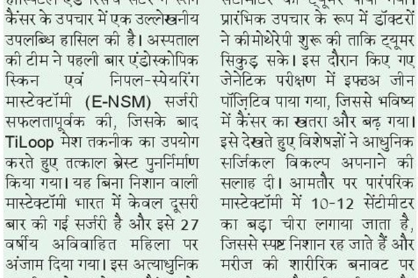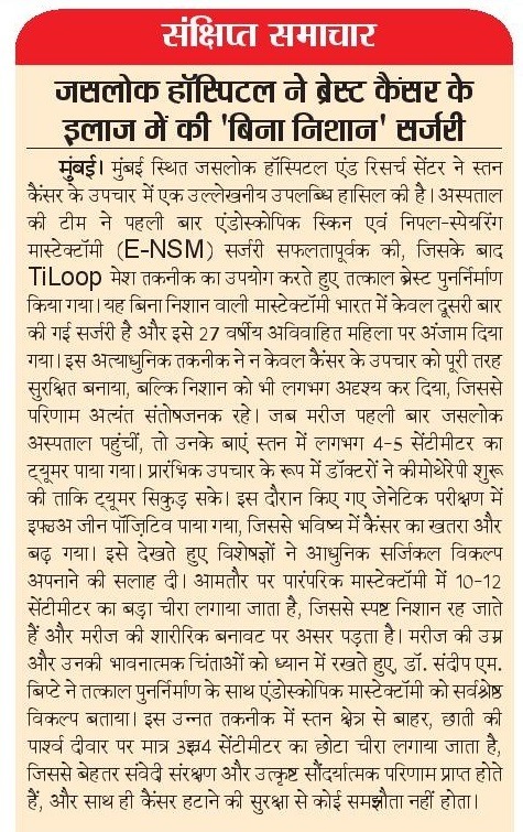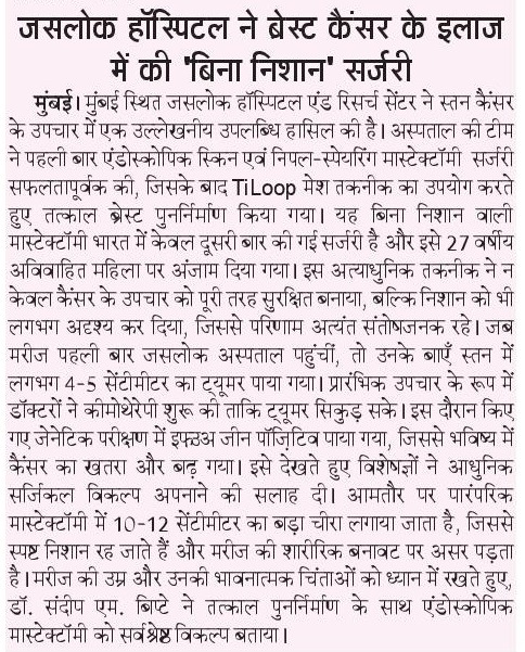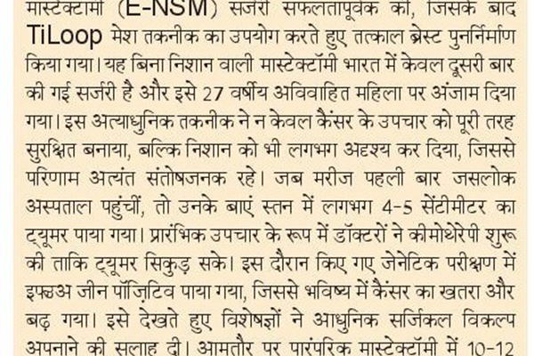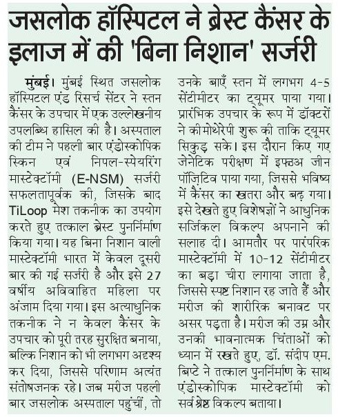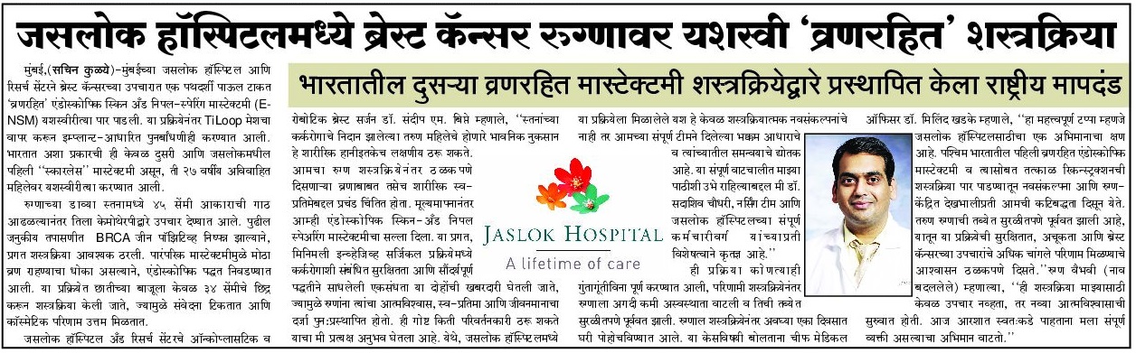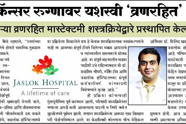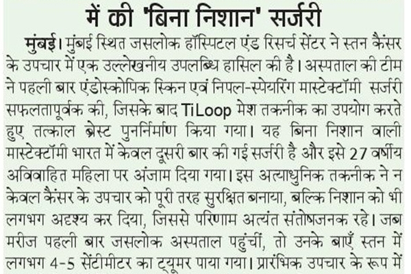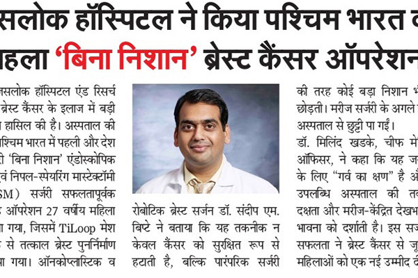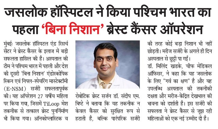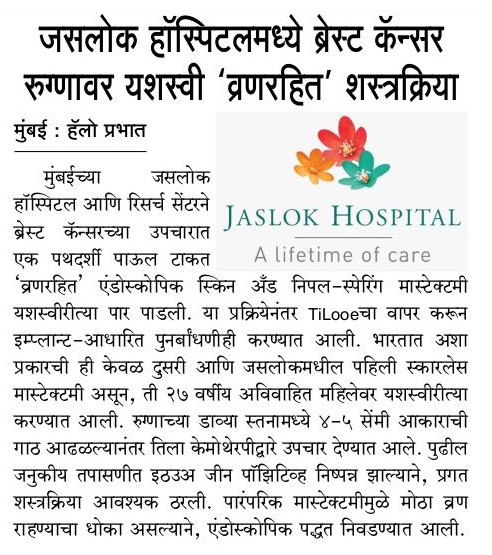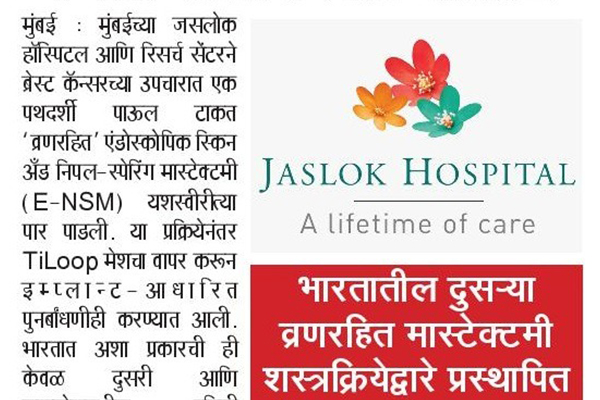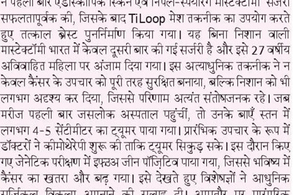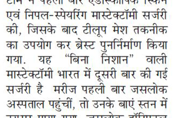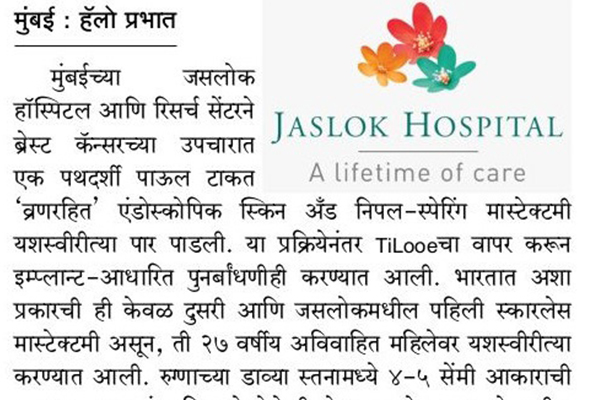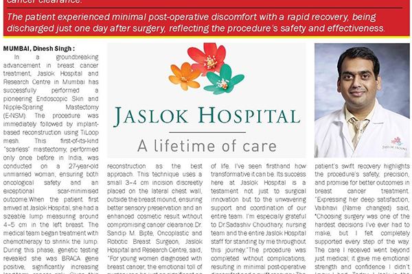 Jaslok Hospital Performs India’s Second & Western India’s First Scarless Endoscopic Mastectomy with Immediate Reconstruction in Young Breast Cancer Patient